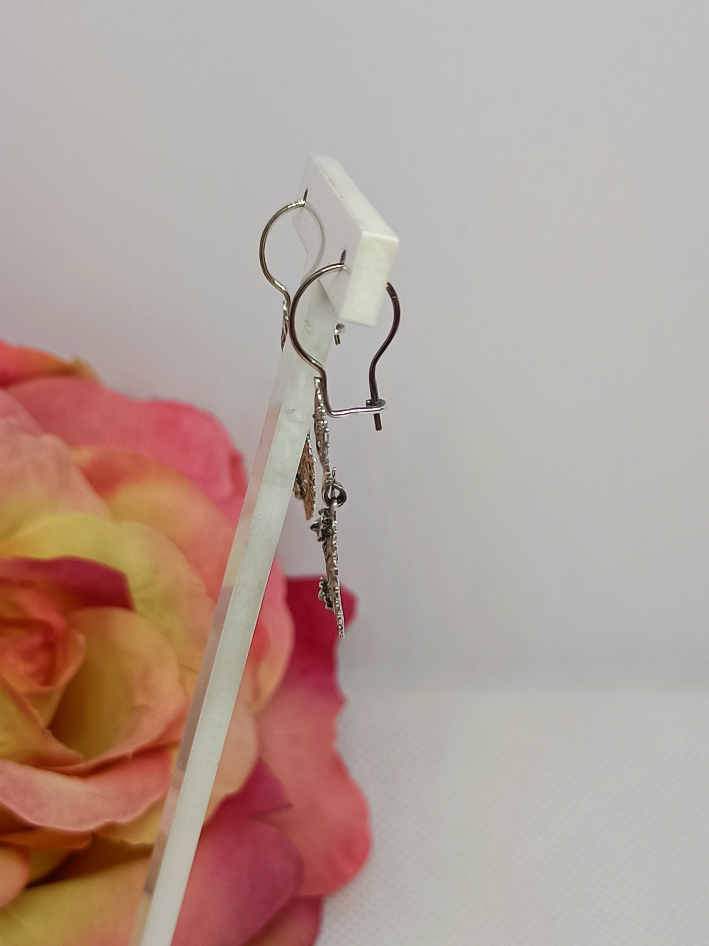 Brincos pendentes prateados em suporte branco com flor cor de rosa ao fundo