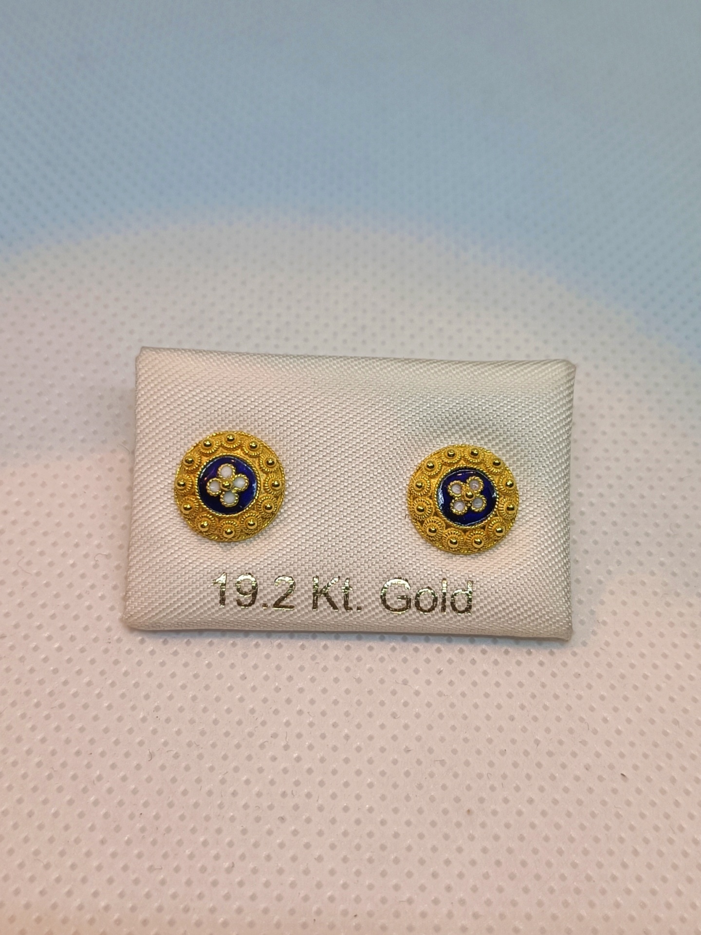 Brincos redondos ouro 19.2 Kt com centro azul e detalhes brancos