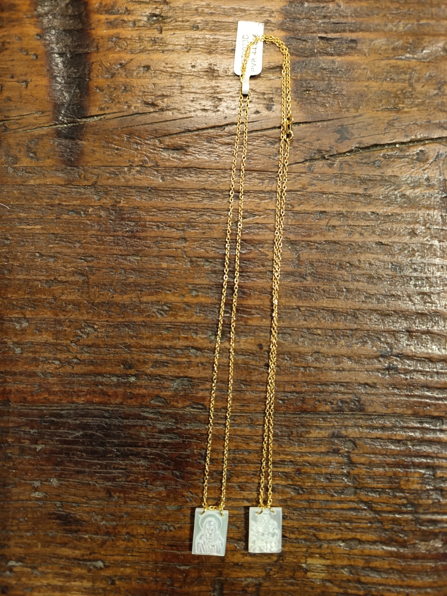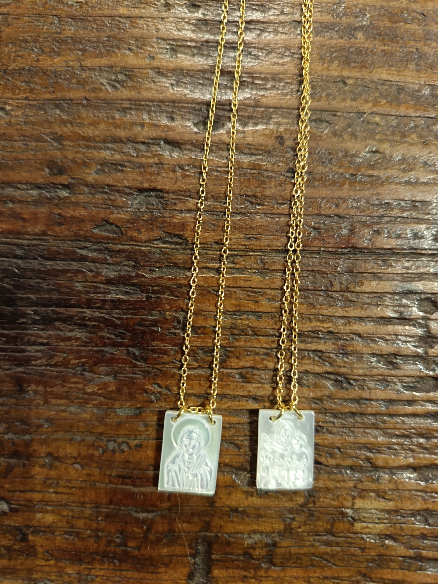 Dois colares dourados com pendentes retangulares em madrepérola com imagens religiosas sobre fundo de madeira