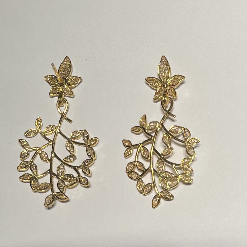 Brincos dourados em forma de ramos com folhas detalhadas e flor na parte superior