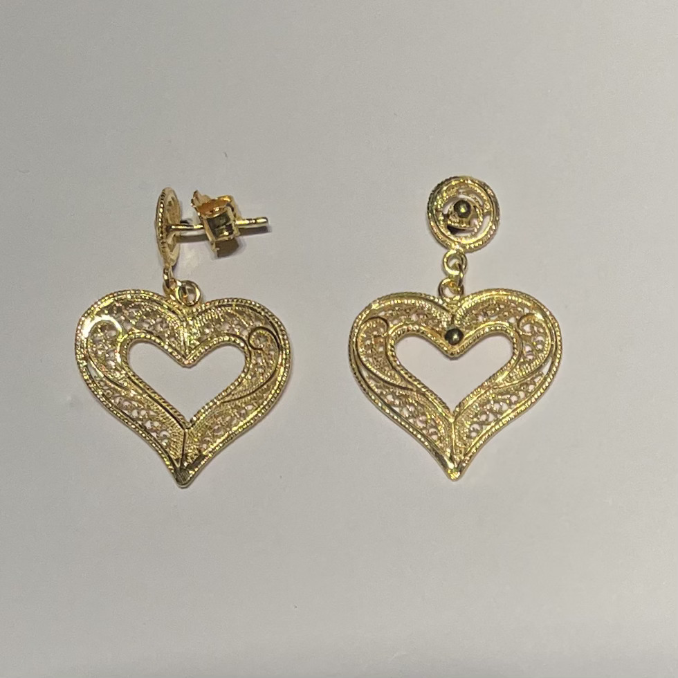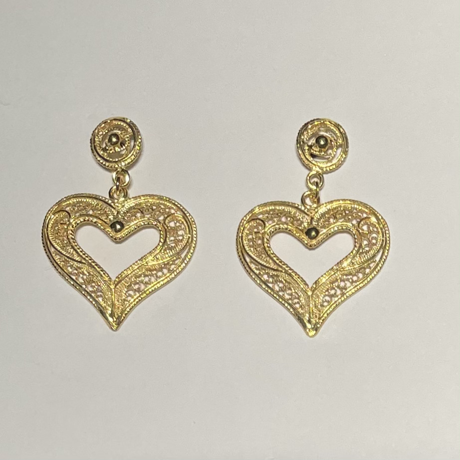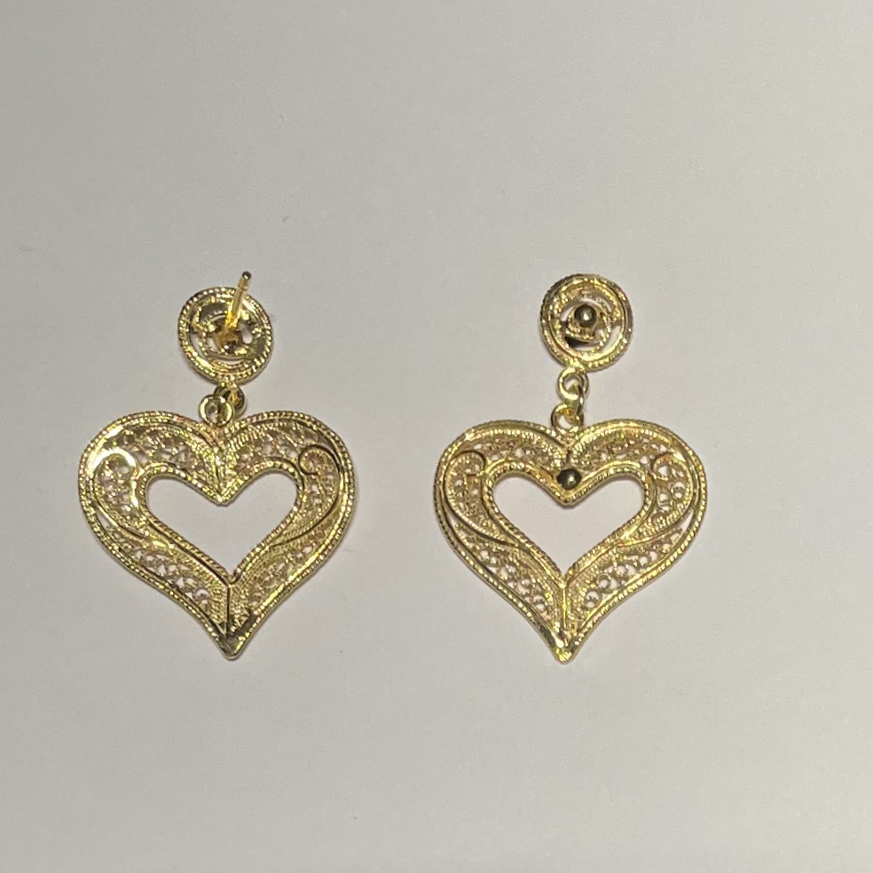 Brincos dourados em forma de coração com decoração detalhada