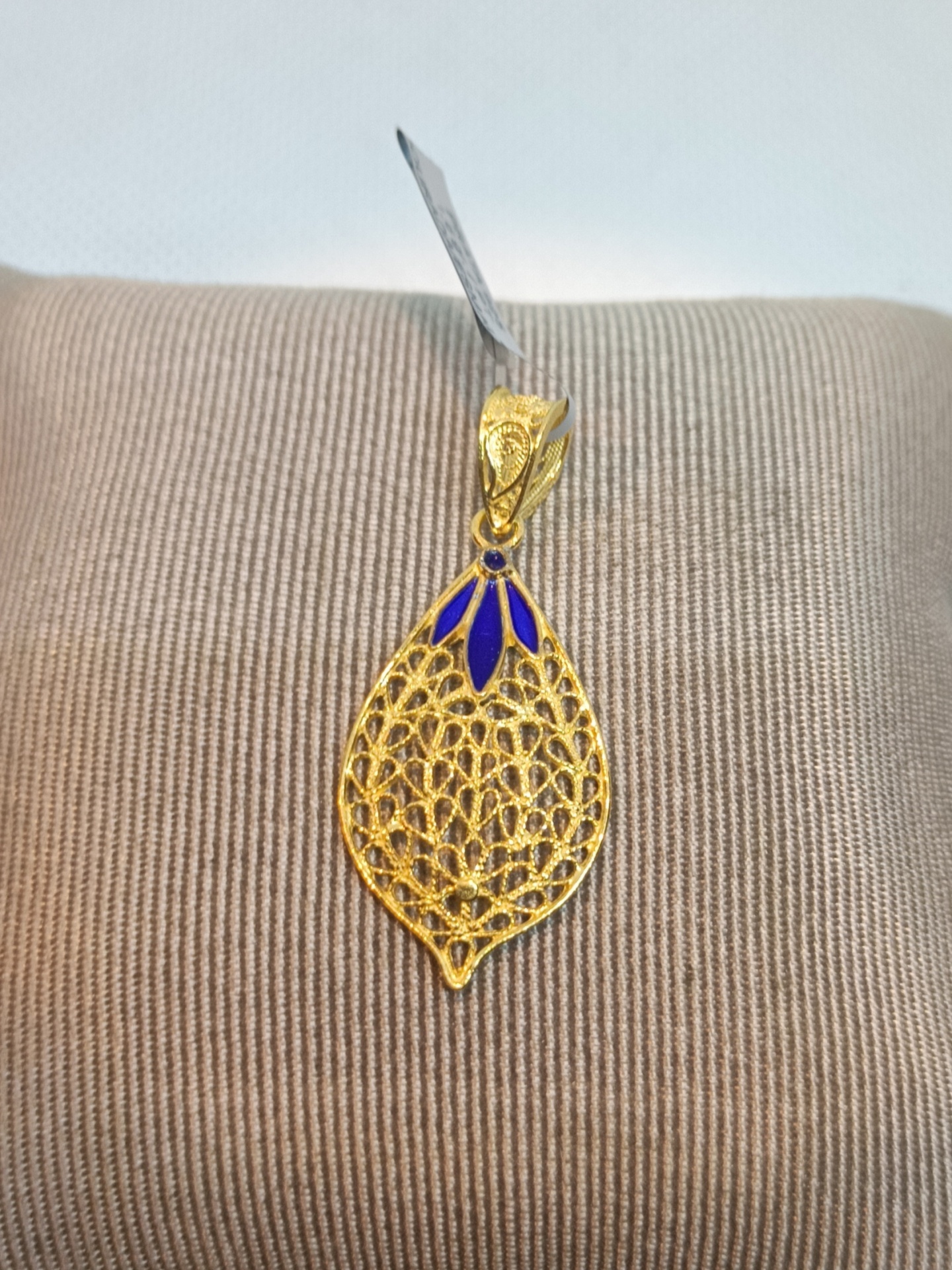 Pendente dourado em forma de folha com detalhes azuis sobre almofada bege