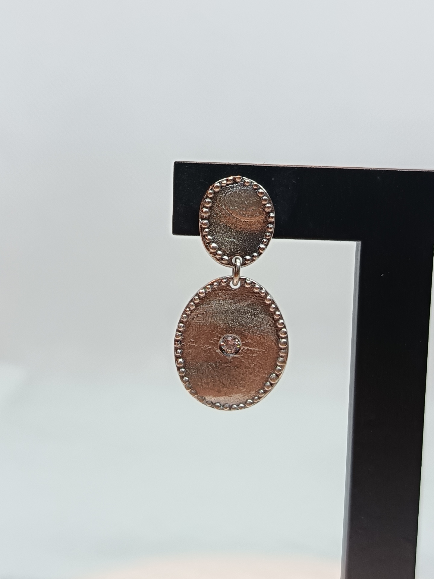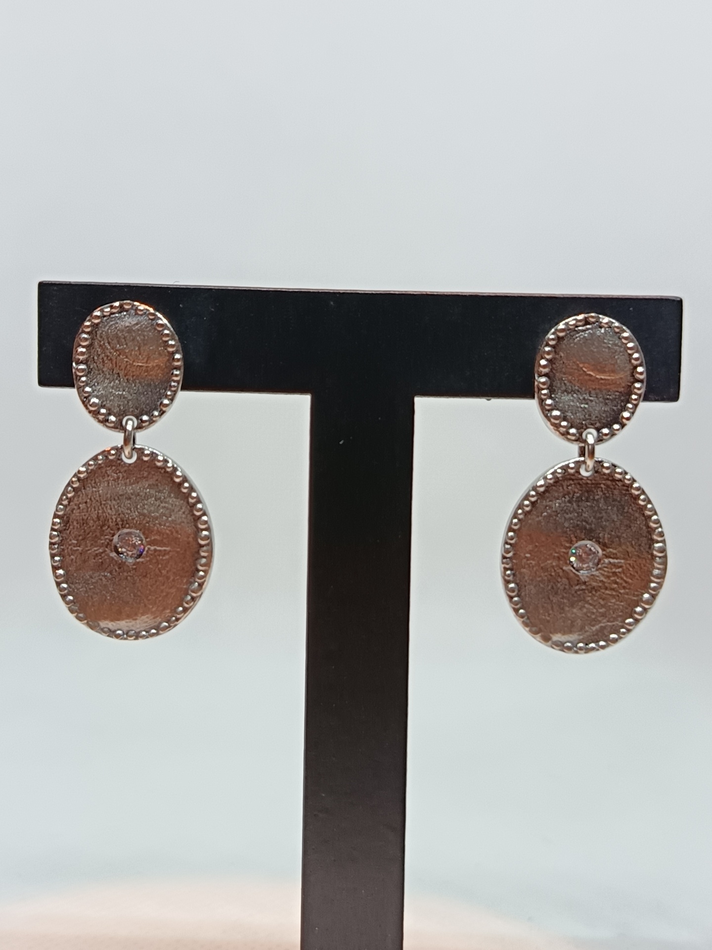 Brincos prateados ovais com pedras centrais em suporte preto