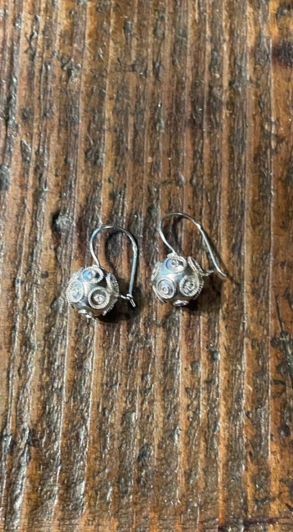 brincos pendentes em metal prateado com detalhes texturados e esferas decorativas