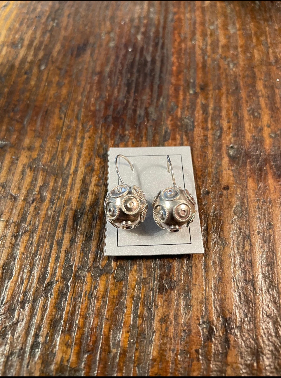 Brincos prateados com padrão espiral sobre madeira