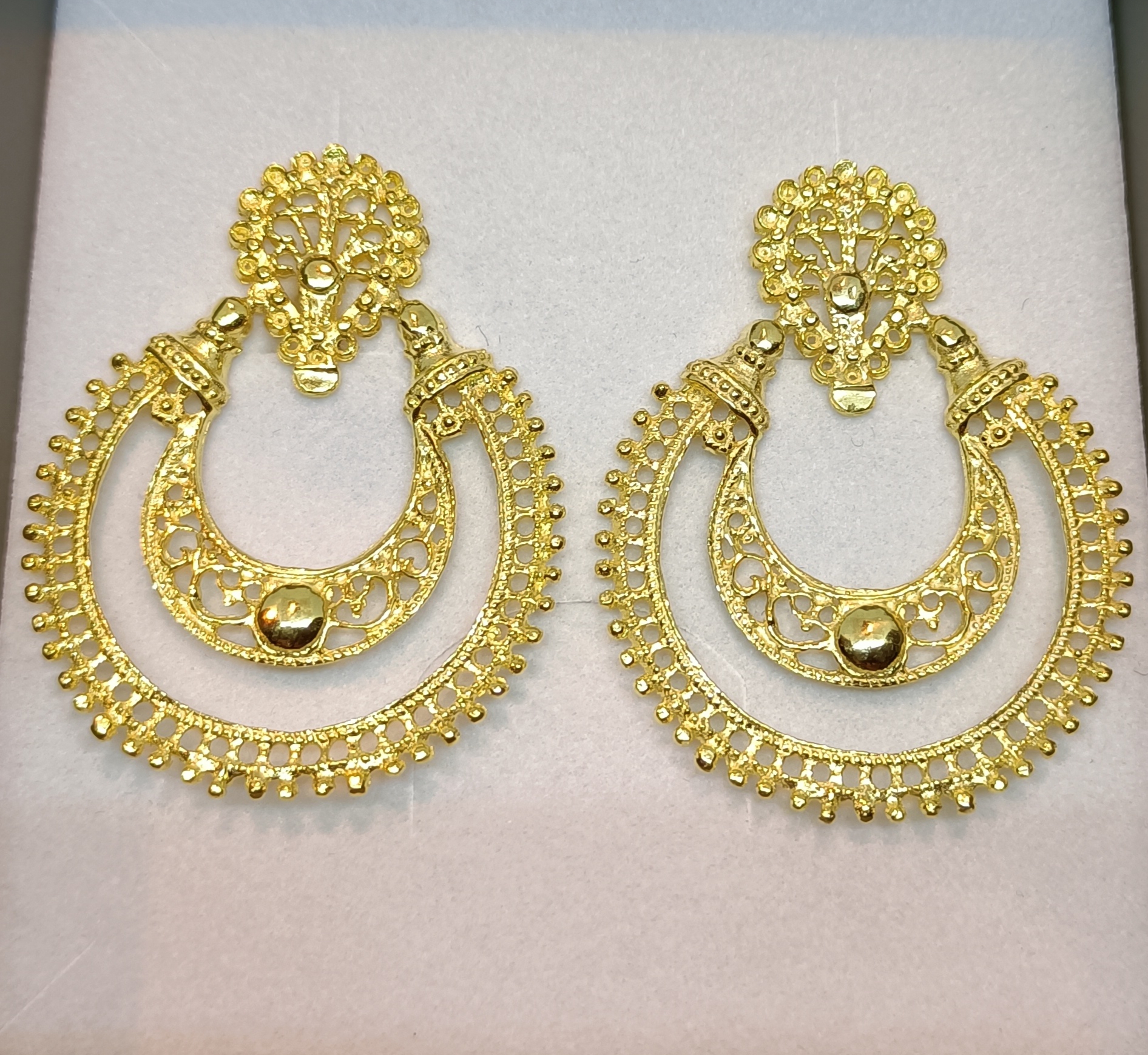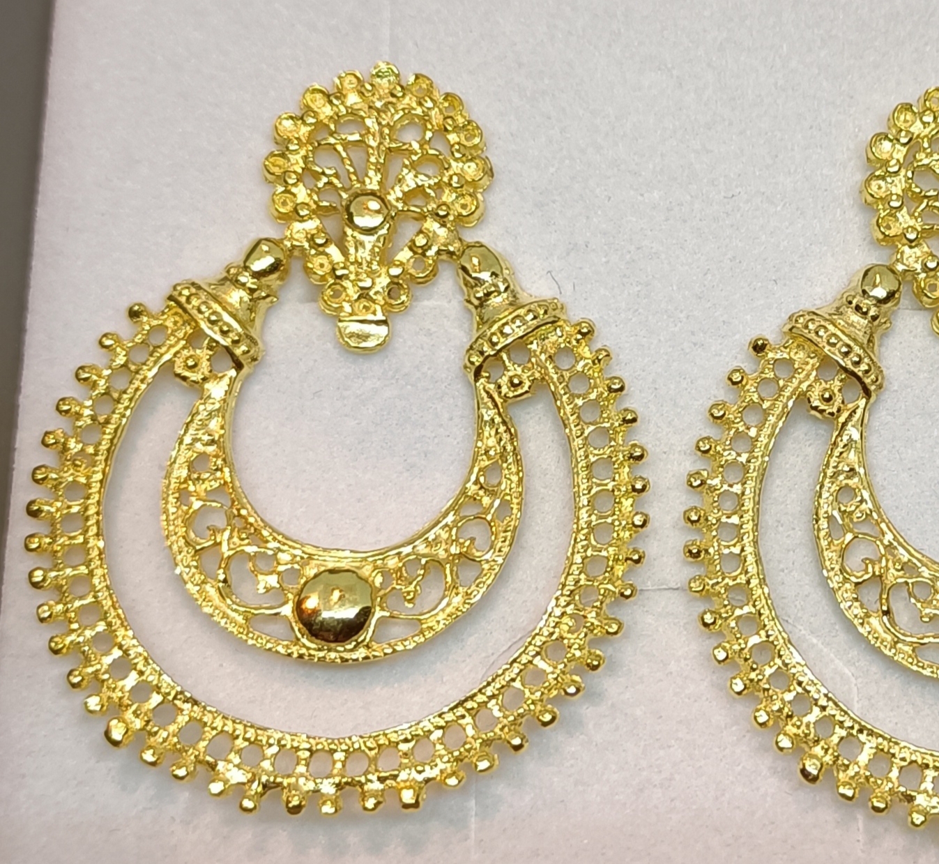 Brincos dourados com detalhes em filigrana sobre fundo branco