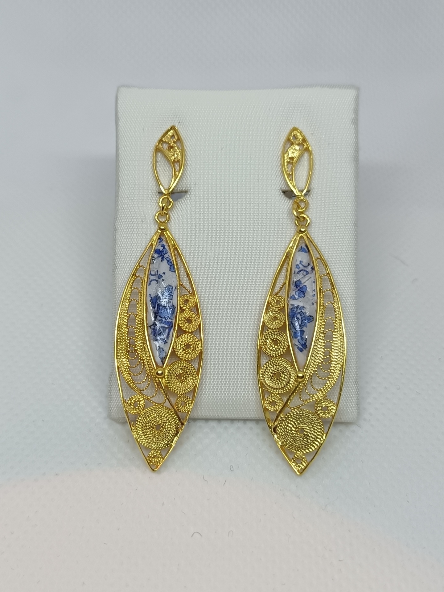 Par de brincos prata 925º% dourada, produzidos manualmente em filigrana com aplicação em azulejo.