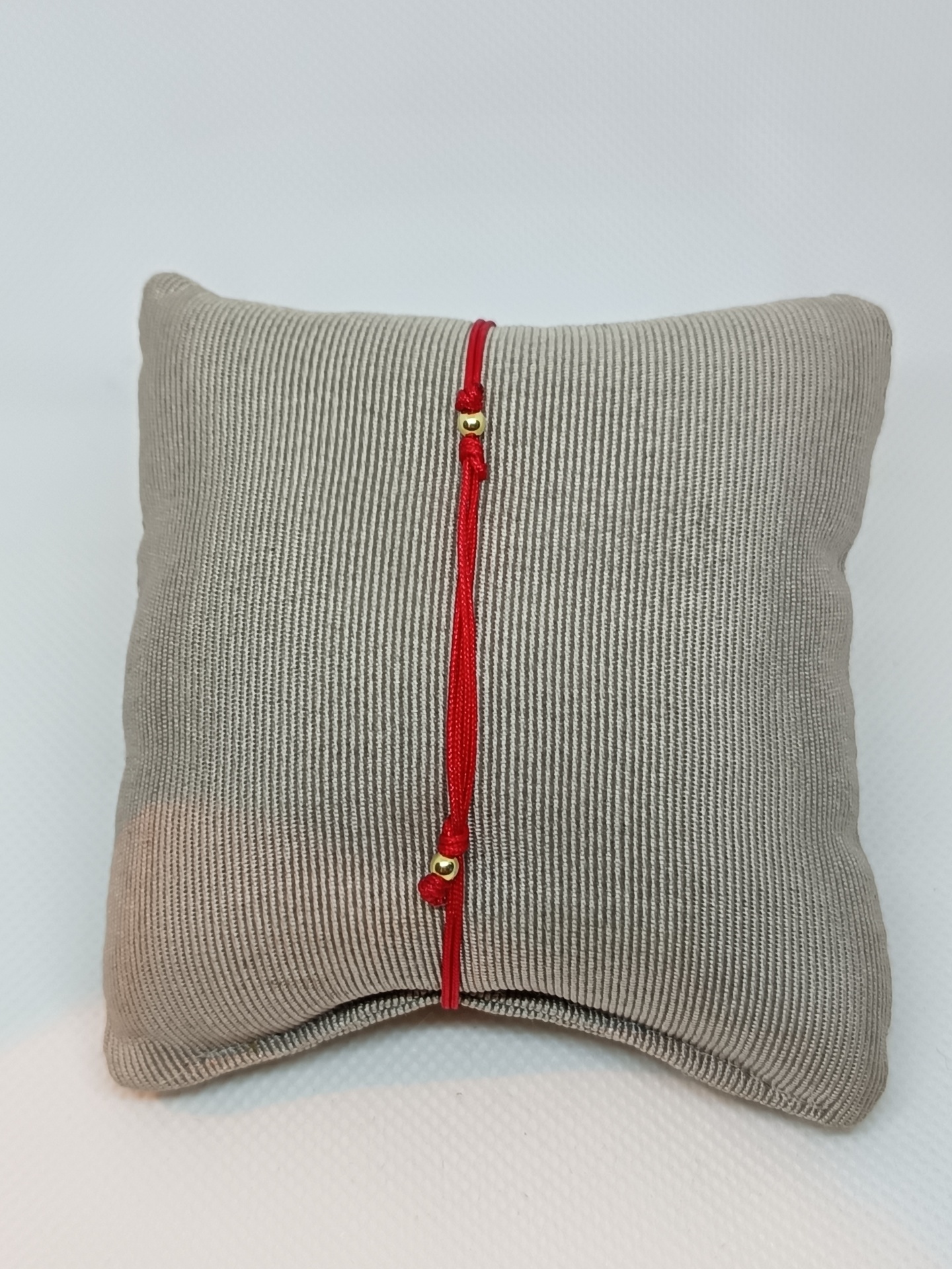 Almofada cinza com pulseira vermelha com detalhes dourados