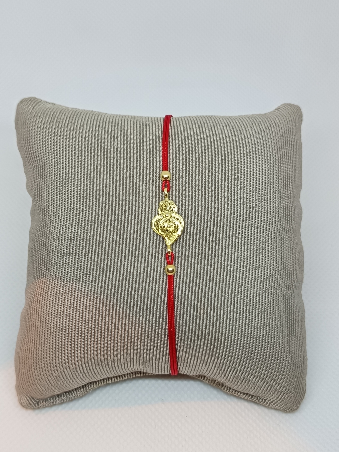 Pulseira vermelha com pendente dourado exibida numa almofada bege riscada