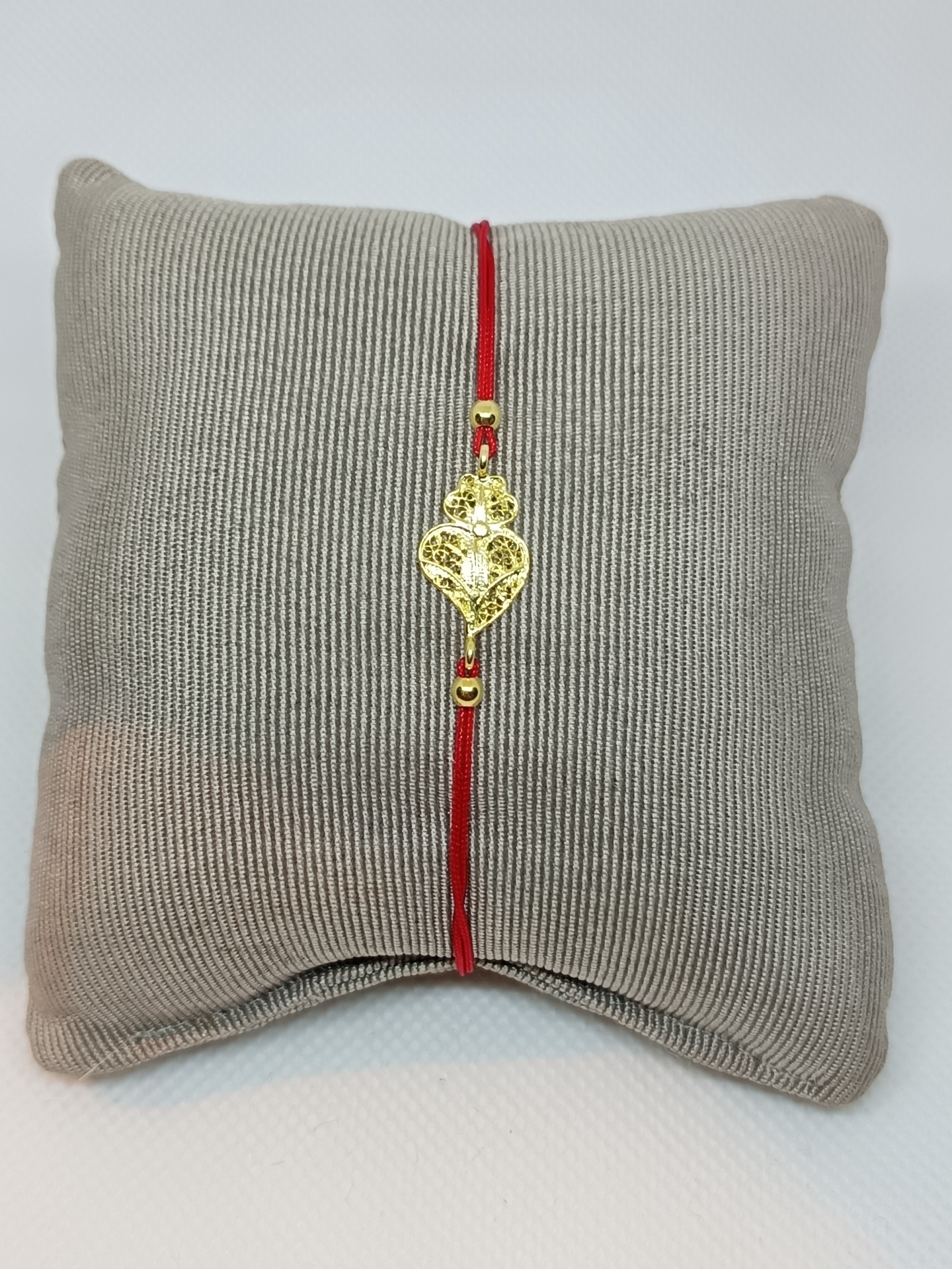 Pulseira prata 925º% dourada em formato coração filigrana, com fio de seda vermelho ajustável.