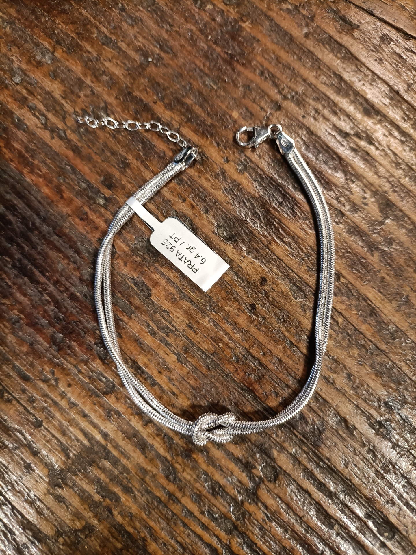Pulseira de metal prateado com nó central sobre superfície de madeira