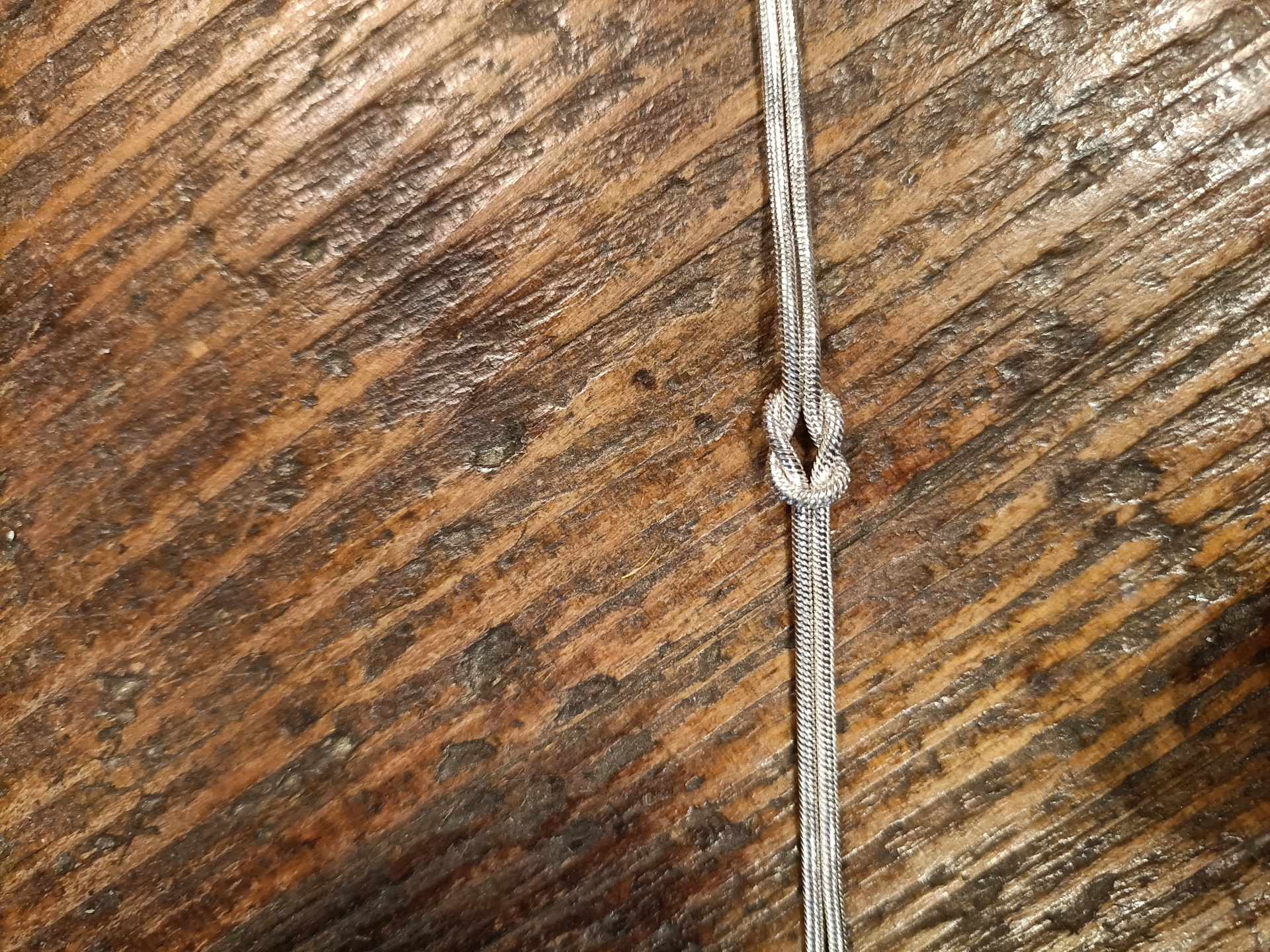 Cordão prateado com nó sobre madeira clara
